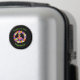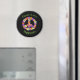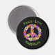 Este ímã apresenta um sinal de paz floral em tons de rosa, amarelo, laranja, roxo, verde, branco e preto cercado por "Paz, Amor, Felicidade".