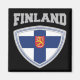 A bandeira nacional da Finlândia é infundida numa forma de escudo que tem contornos azuis e brancos nas cores da bandeira. O nome do país é adicionado acima da imagem.