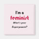 "Sou feminista, qual é a sua superpotência?" Um slogan divertido com uma mensagem séria: desafio e poder. O texto está em caracteres negros, num fundo cor-de-rosa pálido, com "feminista" em cor-de-rosa profundo para contrastar.