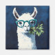 Playful twist to cute animal art and humor with a quirky white llama rocking teal glasses and holding a leafy branch.