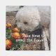 The design depicts a peaceful, free, happy and loving bichon taking time to smell the flowers