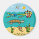 Snorkel design apresenta um snorkeler entusiasmado usando equipamento básico (snorkel, óculos, nadadeiras) para cruzar debaixo d'água olhando para a vida selvagem. Inclui uma tartaruga, casal de peixes, amêijoas e algas - tudo em uma figura de palitos gráfica para snorkeling divertido.