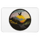 A sticker with an eagle flying over a mountain, in the style of contemporary landscape, golden light, black mountain college, fisheye lens, arts and crafts movement, mid-century illustration