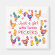 Um desenho colorido de desenhos coloridos de galinhas, com um comentário engraçado e espirituoso, dizendo: Só uma garota que ama bichas