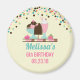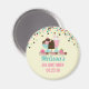 Um ímã festa de aniversário. Personalizado com nome e data do evento. Projetado com um tema de sorvete doce. Um confete colorido espalhado ao longo da parte superior e ilustrado com um bar de chocolate, um sundae de 3 colheres com uma cereja no topo, e um float de morango com chantilly. Pequenos morangos e cerejas ao longo do fundo. Fundo amarelo pálido. Refrescando curativos de tempo quente.