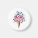 Cone de waffle doce com cereja japonesa rosa e fresca floresce em fundo branco com listras de cor azul. Cereja japonesa rosa.
