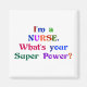 "Sou enfermeira. Qual é o seu super poder?" design de texto, imã de geladeira.