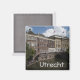 A ponte de Stadhuisbrug sobre o canal Oude Gracht em Utrecht, Países Baixos, com a Câmara Municipal de Utrecht ao fundo, à direita.
