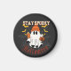 Bold ghost wearing an orange beanie with a jack-o-lantern bucket, set against spiderwebs and red Stay Spooky script—an energetic Halloween design for shirts and hoodies.
