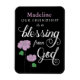 Expresse seus sentimentos sobre sua amizade com esta design de tipografia de caligrafia frontal personalizada com a mensagem, "NOME PERSONALIZADO AQUI nossa amizade é uma bênção de Deus." O design aparece em letras brancas sobre fundo preto e é acentuado por uma bela flor púrpura no canto inferior esquerdo do design.