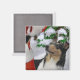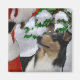 Arte de Natal impressionante para amantes lisos com um collie liso tricolor que arrisca Papais noeis em uma cena de floresta de inverno. Nossa exclusiva série "Eu Ainda Acredito". Dons de Natal deliciosos ou se trate!