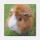 Fotografia de um porco-da-índia vermelho e branco, de pêlos longos, na erva.