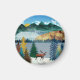 Uma bela paisagem com cores e texturas únicas mostrando uma paisagem de montanha e lago e uma floresta multicolorida com um sol ascensão e um alce em tons de azul, verde, ouro e magenta.