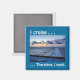O ímã que mostra um pôr do sol no mar expressa o sentimento de muitos que vivem (e, portanto, têm de trabalhar) para cruzar. as palavras, " Eu cruzo. . portanto, eu trabalho:"