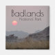 O sol está se pondo no Parque Nacional das Badlands. O sol é uma bela cor rosa com um céu roxo claro.