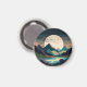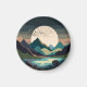 Uma paisagem abstrato de uma enorme superlua em uma cena de lago montanhês com um bando de pássaros em texturas ousadas e tons escuros de marrom, bege, bronzeado, azul, ciano e preto.
