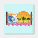 Gráfico de surfe do Havaí colorido, pôr do sol com flores de hibisco, estátuas de tiki e palmeiras.