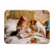 Vintage illustration of a lovely young girl praying before having breakfast in bed while a cute little kitten and a small dog are watching, eager to catch a piece of food. Oil on canvas by Charles Burton Barber.