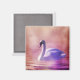 Uma encantadora imagem de conto de fadas. Foto romântica macia de um cisne branco em luz roxa nadando em um lago magra. Púrpuras e pinças coloridas criam um humor mágico místico.