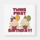 Gêmeos, T-shirts de primeiro aniversário, fatos-chave, ímanes, cartas, posters, guardas e mais com um bebê e gêmeos em chapéus de festa e balões e texto com a seguinte redação: "Twins Primeiro Aniversário!".