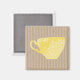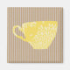 O encantador design moderno apresenta um fundo listrado castanho claro com uma xícara de café amarela ensolarada no centro.