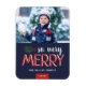 Ímanes de fotos de feriado personalizados impressos com modelos simples para personalização. Esta design moderna tem uma mistura festiva de tipografia em vermelho e branco sobre fundo azul marinho. O texto diz "Tão Feliz". Personalize-o com suas fotos e adicione seu nome de família e o ano. Use as ferramentas de design para editar o texto, adicionar mais fotos e criar uma única de uma espécie de design de ímã de fotos de Natal.