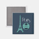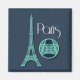 Esta arte apresenta um design da Torre Eiffel em cima de um fundo azul escuro.