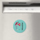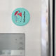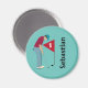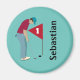 Golfista personalizado azul, vestindo um boné, camisa vermelha profunda e calças azuis, colocando uma bola de golfe em um ímã de buraco. Personalize o texto.