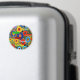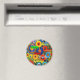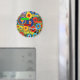 Círculos concêntricos vibrantes de várias cores preenchem a impressão, cada um acompanhado por palavras instigantes diferentes.