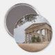 Fotoímã redondo com as ruínas do antigo templo grego em Segesta, Sicília, Itália, visto sob uma oliveira antiga num dia nublado.