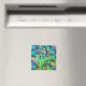A imagem apresenta uma coleção vibrante de silhuetas de cão organizadas em um padrão de prancha de xadrez. Cada cão exibe uma combinação única de cores e padrões, criando uma composição divertida e viva.