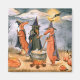 Três Dachshances em chapéus e capas de bruxa se encontram em uma lua limpando para cozinhar alguns ossos de guisado em seu caldeirão. Acima, outro Dachsie voa em frente à lua em uma vassoura. Esta ilustração de feitiçaria é perfeita para o Halloween ou para o amante de cachorros Wiccan Wiener em sua vida.