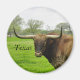 Um ímã redondo do Texas Longhorn. Laranja queimada Longhorn contra morro verde. Foto original de Cherie Haines.