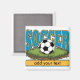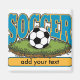 Um futebol fica pronto na grama com grande texto azul SOCCER traçado em amarelo! Adicione seu texto personalizado abaixo deste design de futebol no espaço fornecido. Perfeito para qualquer jogador de futebol ou fã de futebol, adicione nomes, nomes escolares ou mensagem desportiva! Camisas de futebol personalizáveis e presentes de futebol!
