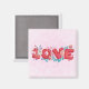 Um ímã com o Love escrito em uma fonte ousada em estilo de bloco cercado por corações e lindas flores. Criado com aquarelas. Rosa claro de fundo padronizado.