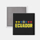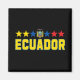 Equador em texto amarelo com trim azul com a casaco de braços sentados acima, ao lado de estrelas decorativas nas cores da bandeira nacional.