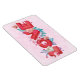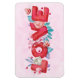 Um ímã flexível com o Love escrito em uma fonte ousada em estilo de bloco cercada por corações e lindas flores. Criado com aquarelas. Rosa claro de fundo padronizado.