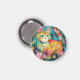 A vibrant cat with striking green eyes is surrounded by a lush array of colorful flowers and leaves. The use of bold hues like orange, teal, and pink creates a whimsical and enchanting scene.