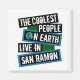 This design features bold, layered text with the phrase "The Coolest People on Earth Live in San Ramon" in a striking cool color palette. A globe graphic, integrated with coordinating blue and green blocks, symbolizes the city's global appeal. The design is suitable for showcasing local pride, as it boldly declares San Ramon's unique charm as a popular city in the northern California area. Colorful eye-catching visuals serve to foster a sense of community and identity among residents.