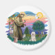 O santo Francis, uma figura amada que atravessa linhas denominacionais, é o santo paternalista dos animais. A figura mostrada aqui foi adaptada de uma obra-prima do século 14 por Giotto e inserida em um fundo original, aqui mostrado com um Terrier Tibetano branco.
