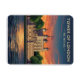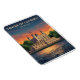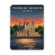 A picturesque illustration of the historic Tower of London with a vibrant sunset sky and its reflection shimmering on the water.