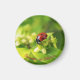 Uma joaninha vermelha brilhante sentada em folhas verdes frescas sob feixes de sol do meio-dia. Linda cena de férias. Há uma diferença de nomes: ladybug nos Estados Unidos e ladybird no Reino Unido para a mesma criatura.