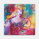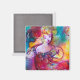 Colorida, pintura contemporânea em aquarela caprichosa e artística, figurativa abstrata com três figuras de jogadores, redemoinhos florais, rosas, flores, brilhos dourados e folha de prata em cores vibrantes como amarelo, vermelho, verde, azul e rosa fúcsia.