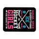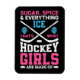 Tema de hóquei, ímã flexível para a garota de hóquei com paus de hóquei, varas e capacetes com texto rosa, branco e azul que lê Açúcar, Especiarias e Todo Gelo É do que as garotas de Hóquei são feitas!