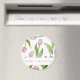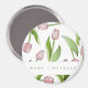 O design do produto apresenta um padrão de flores tulipas cor-de-rosa. Esta ilustração botânica com texto personalizado faz ímanes redondos modernos e únicos - Ideia de presente para aniversário, Páscoa, Dia das Mães, favores de casamento e muito mais!