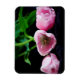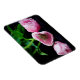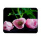 Fotografia viva de tulipas cor-de-rosa cortadas frescas, com caules verdes longos, colocada sobre o tecido preto. Copyright ©Kimberly J Tilley.