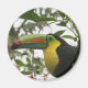 Uma fotografia de um tucano colorido sentado num galho de árvore na selva. Flores e folhas enormes ao redor do tucano.