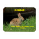 Uma fotografia de um Coelho a comer erva e ervas daninhas que é brilhante e colorido. Com os ouvidos levantados e mastigando-os ao seu janto. Isso é em um Magnet Quadrado.