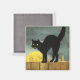 Ilustração vintage de Halloween mostrando um gato preto em uma cerca com uma lua atrás.