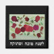 Ilustração gráfica de romãs, maçãs e folhas. Tradução hebraica de L'Shanah Tovah Umetuka: Desejando a você um doce e bom ano para o Ano Novo Judeu. Abençoa-se a maçã mergulhada no mel, que simboliza um ano doce, e que os nossos méritos devem ser tão numerosos como as sementes de um romã.